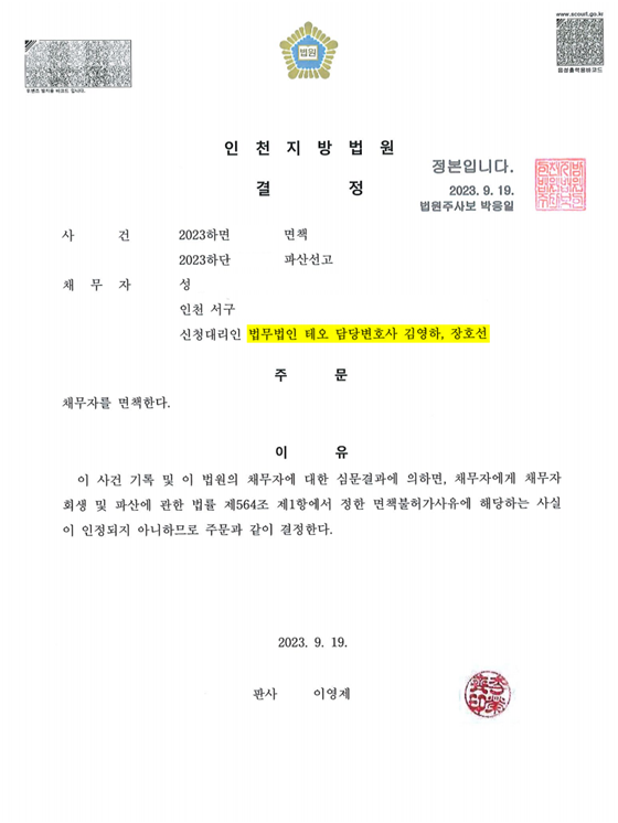 6월 신청서 접수 후 3개월만에 빠르게 파산폐지 결정 및 면책 결정을 받았습니다.