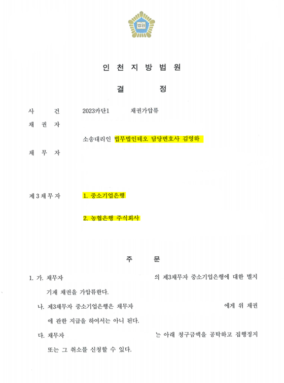[민사신청] 상대방 은행계좌 2개 일괄 가압류 인용