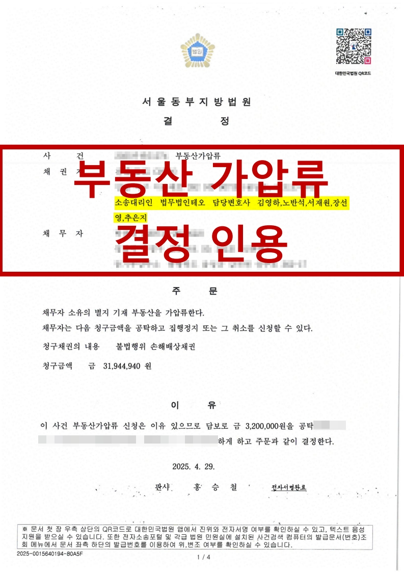법원의 인용 결정으로 피고 명의의 부동산에 대한 가압류가 신속히 집행되었습니다. 이를 통해 본안 판결 전 의뢰인의 권리를 효과적으로 보호하고, 향후 집행 가능성까지 확보한 성공적인 조치였습니다