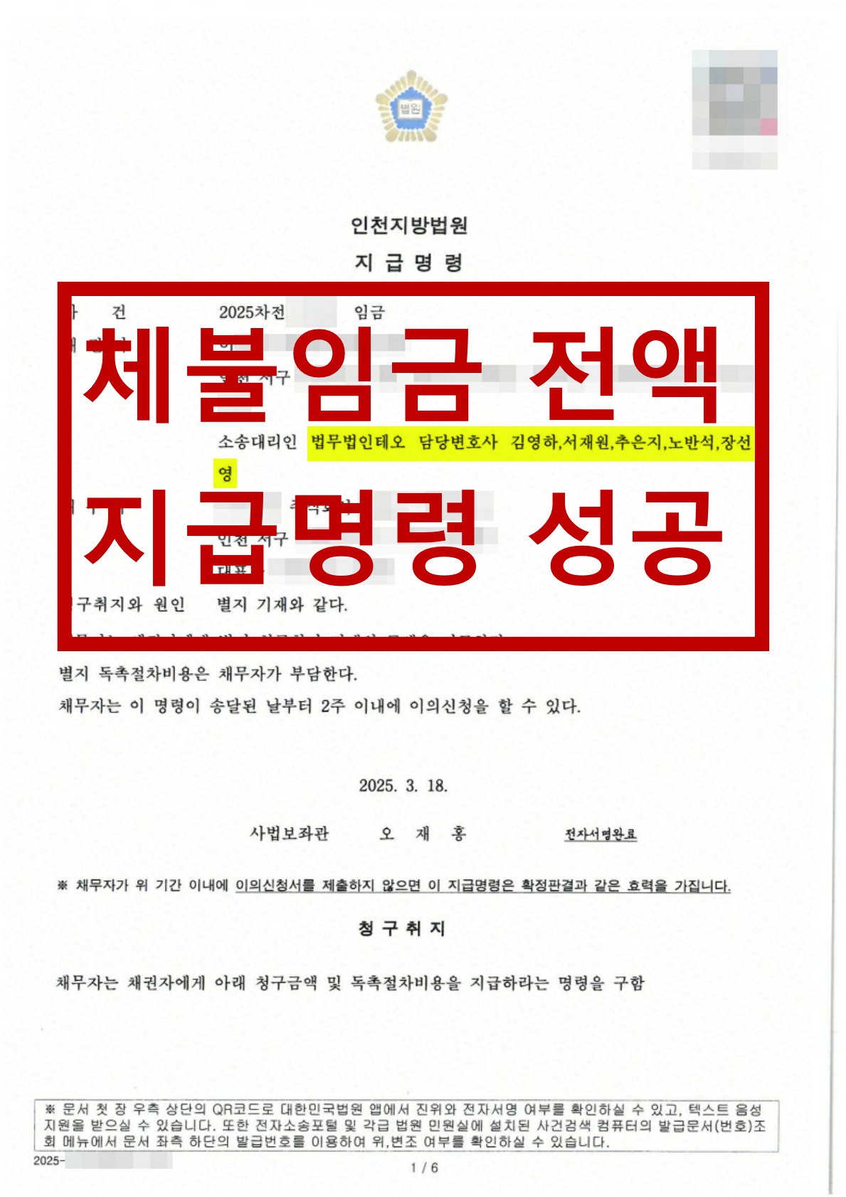 법원은 채권자의 주장을 받아들여 전액 지급명령을 결정하였고, 상대방이 이의신청을 하지 않음에 따라 지급명령은 단기간 내에 확정되었습니다. 이에 따라 의뢰인은 퇴직위로금 잔액과 더불어 지연손해금 및 절차비용 전부에 대해 집행 가능한 권리를 확보하게 되었고, 체불 위로금 문제를 실질적으로 해결할 수 있게 되었습니다.