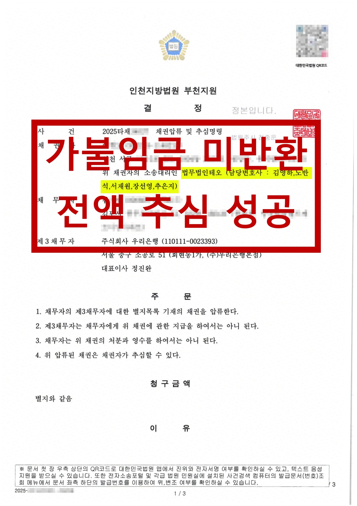 법원은 채권자의 신청을 받아들여 채무자가 보유한 예금 채권에 대해 압류 및 추심명령을 결정하였고, 이를 통해 의뢰인은 정당한 권리를 실현할 수 있는 법적 기반을 갖추게 되었습니다. 금액의 많고 적음을 떠나, 근거 있는 채권은 반드시 회수되어야 한다는 원칙 아래, 법무법인 테오는 끝까지 함께했습니다.