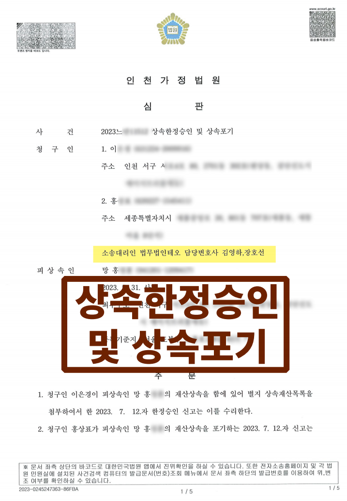 법원은 법무법인 테오의 주장을 전부 인용하여 한정승인 및 상속포기를 인용한다는 심판을 내렸습니다.