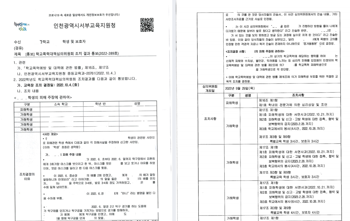 결국, 가해학생들 모두에게 1호, 2호, 3호의 조치결정을 받아 내었습니다.
