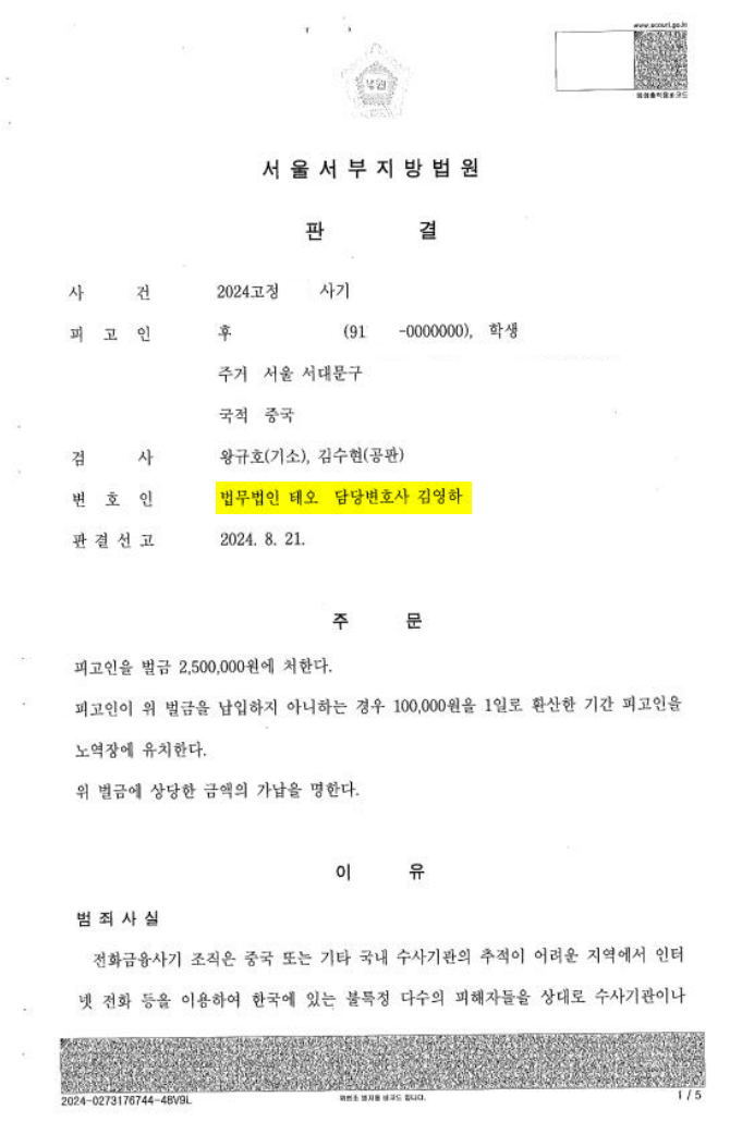 의뢰인은 본인의 꿈을 펼치기 위해 유학 온 외국인 대학원생으로, 보이스피싱 조직의 현금수거책 아르바이트를 하였던 사건입니다.