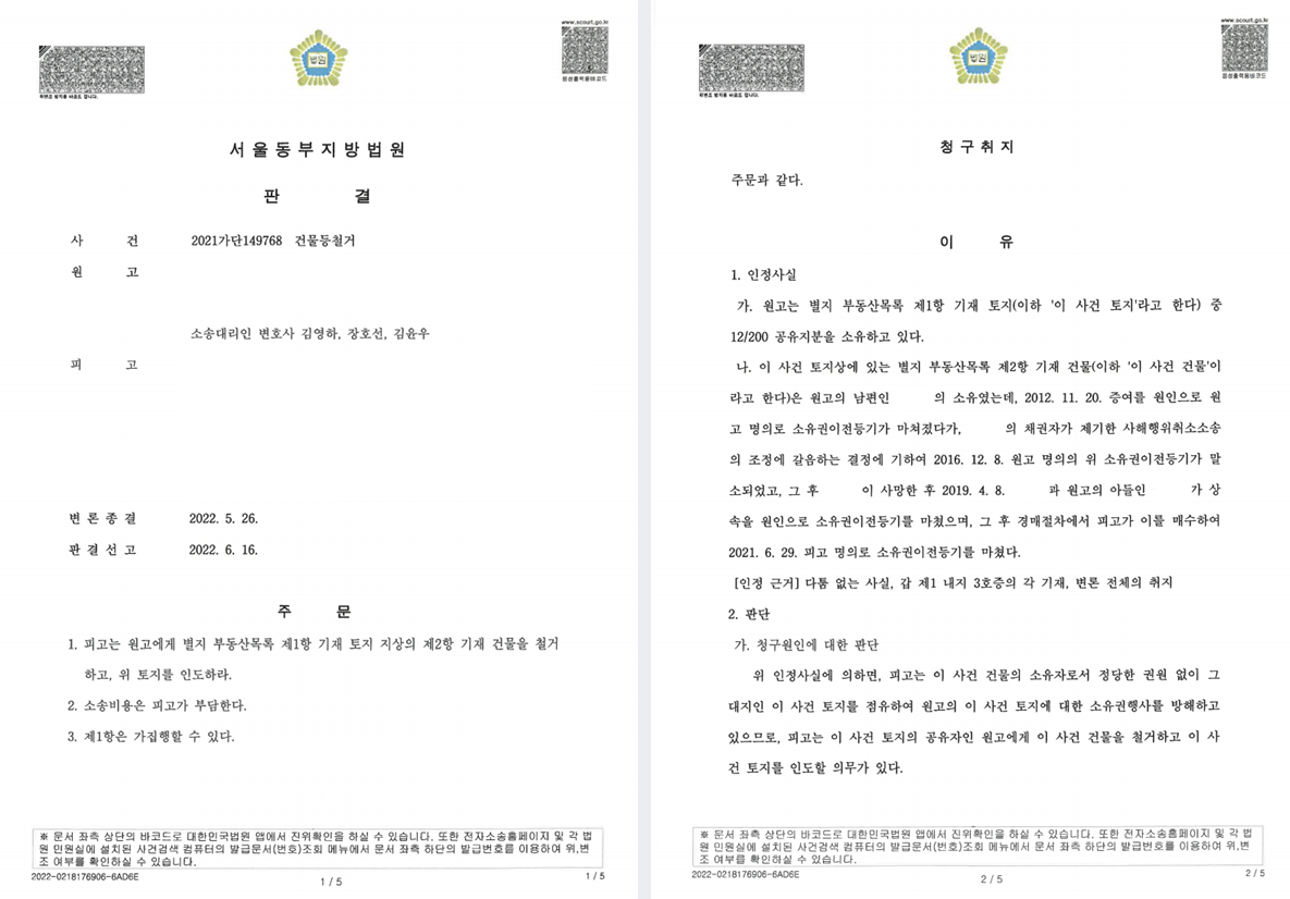 그 대지인 이사건 토지를 점유하여 이 사건 건물을 철거하고 토지를 인도하라는 청구가 모두 인용되어 전부 승소함.